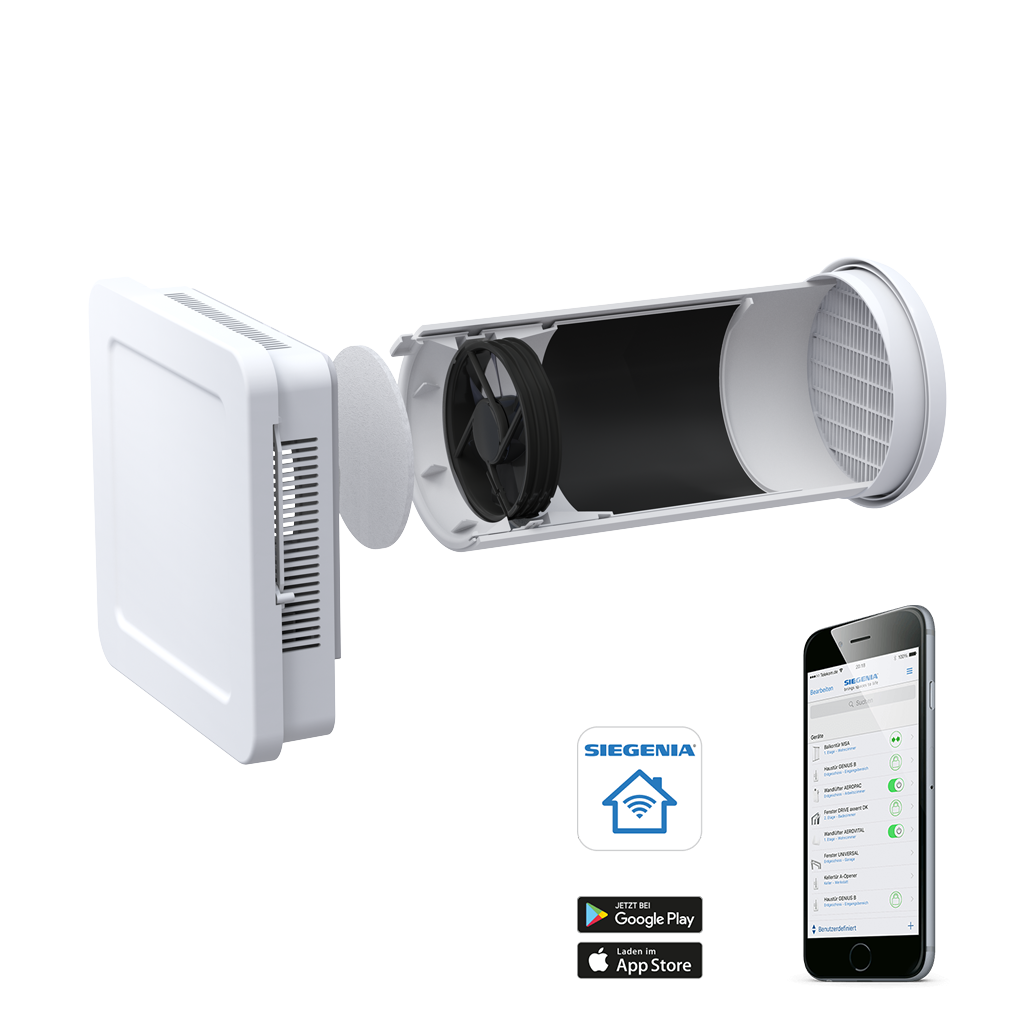 Kde je potrebné privetrávanie a odvetrávanie, tam sa aktívny vetrací prístroj AEROTUBE AZ smart môže pri identickom vzhľadu používať napríklad v jednej miestnosti ako privetrávací prístroj a v druhej miestnosti ako odvetrávací prístroj. Bez problémov je možná aj párová prevádzka alebo kombinácia s inými variantmi výrobku AEROTUBE. Funkcia Wi-Fi je, rovnako ako u AEROTUBE WRG smart, k dispozícii sériovo, čo umožňuje ovládanie aplikáciou SIEGENIA Comfort.